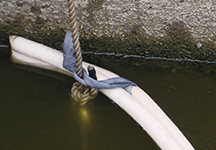 (流れが速い場所では「LCオイルフェンス」だけでは強度不足となるので、他のオイルフェンスに結びつけて浮かべます。)